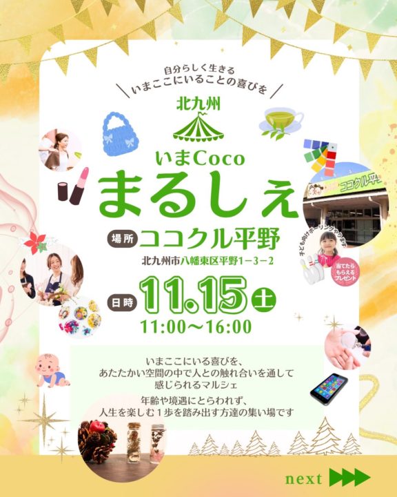 11月15日(土)の第3土曜日、お昼は定例のくるくるスペースparty.(家系図教室や鑑定ブース)に加えて初の企画 いまCOCOマルシェが開催されます。